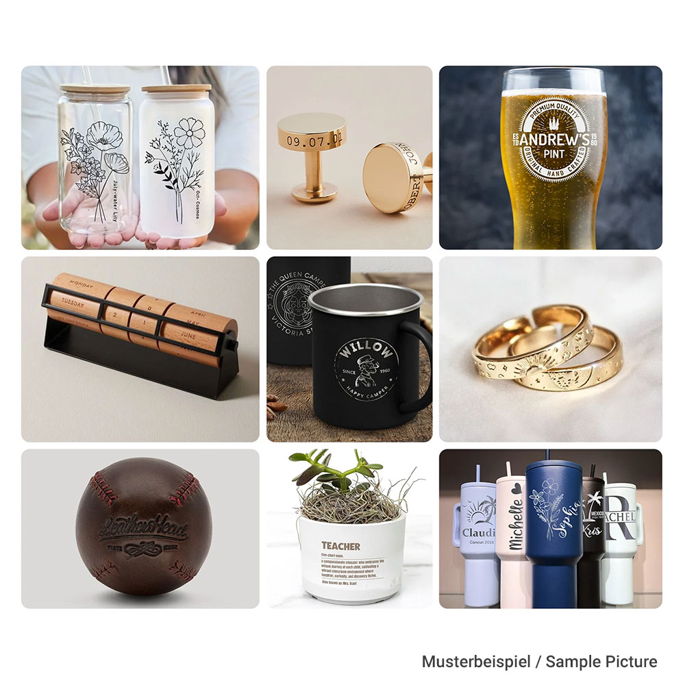 Ob personalisierte Thermosflaschen, Tassen, Ringe, Christbaumkugeln, Baseballs oder kleine Blumentöpfe – die Rotationseinheit macht Ihre Lasergravuren noch vielseitiger.