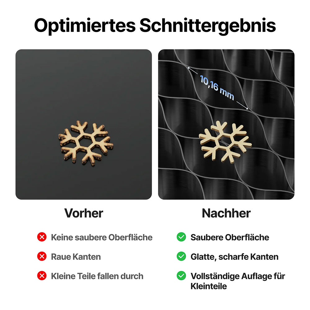 Die xTool Wabenplatte für P3 ist das ideale Zubehör für präzise und saubere Laserarbeiten. Sie verbessert nicht nur die Fixierung Ihrer Werkstücke, sondern sorgt auch für eine optimale Luftzirkulation unter dem Material. Dadurch werden Rauch und Dämpfe effizient abgeleitet, was Schmauchspuren und dunkle Schnittkanten deutlich reduziert.